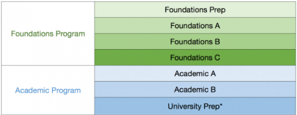 ELC에는 두 가지 프로그램이 있습니다. 기초 교육 프로그램 은 기초 언어 능력에 중점을 둡니다. 이 트랙에 입학 한 학생들은 보통 ELC에 오기 전에 영어로 기초를 닦습니다. ELC에있는 동안 그들은 기술 향상에 노력할 것입니다. 아카데믹 프로그램 은 특히 영어가 교육의 매개체 인 대학에 다니기 위해 영어 실력을 키울 수 있도록 학생들을 준비시키는 데 중점을 둡니다. 학업 프로그램의 학생들은 최소한 중급 이상의 영어 실력을 갖추어야합니다.